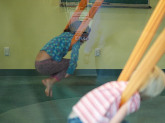 Alani takes this anti-gavity yoga class and was able to invite a friend. Lila was excited to do it with her. It was very cool!